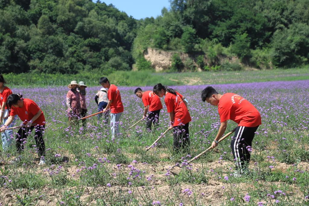 【马鞭草种植园体验】随后,实践队员来到南泥湾经济作物示范园的马鞭草种植基地,亲身体验使用镢头的田间劳作,据技术人员介绍,南泥湾因地制宜将红色资源和生态环境优势相结合,打造经济作物示范园,主栽醉蝶花、马鞭草、美人蕉、太阳花、孔雀草等品种。盛夏时节,南泥湾遍地是花海,处处是风景,成为市民休闲避暑的好去处。