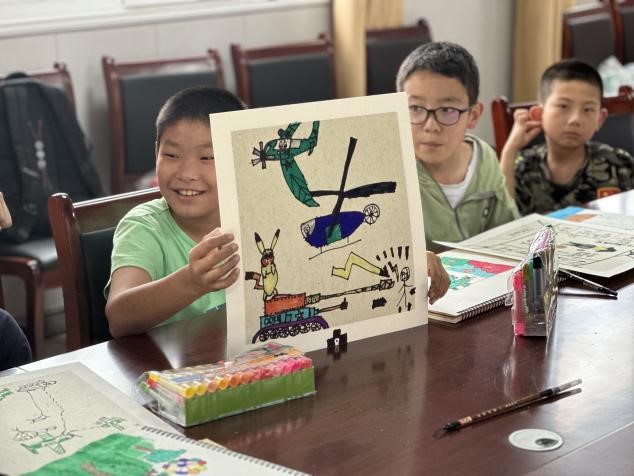 “哥哥,我画的怎么样?”一个小女孩抬着天真可爱的小脸蛋说着。孩子们神情专注地投入创作,脸上始终挂着愉快的微笑,还时不时回过头来问身边的大哥哥大姐姐如何处理一些构图和色彩生的小细节。不一会儿,一幅幅充满创造力的画跃然纸上。