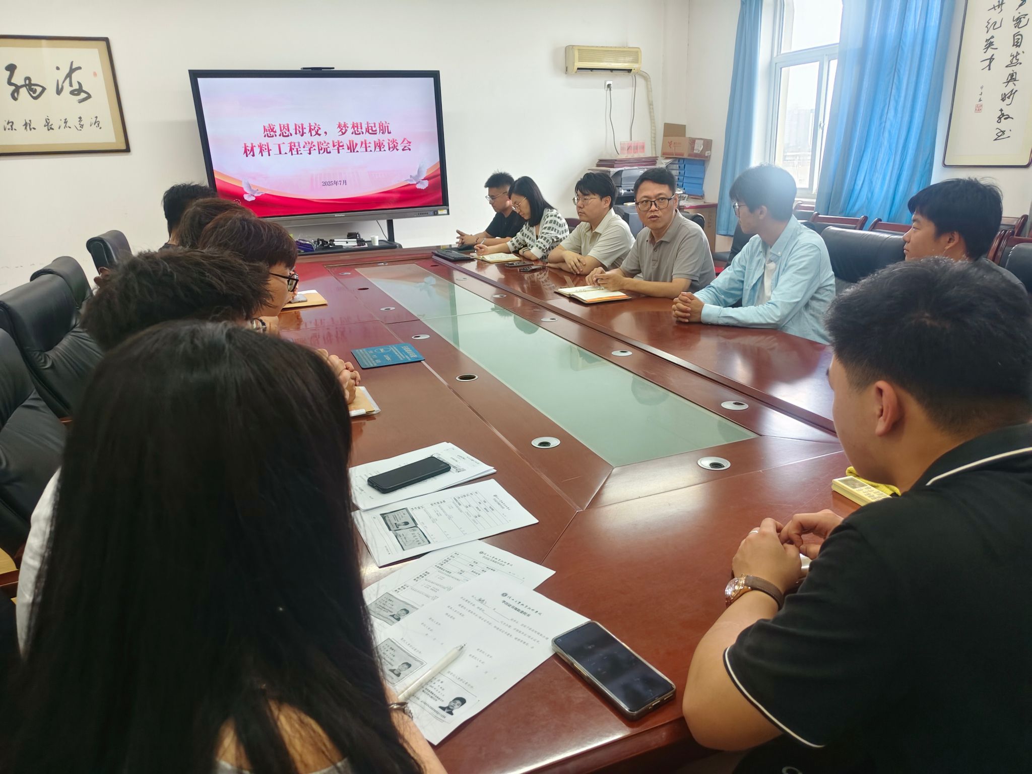 2025年7月3日,材料工程学院在行知e五楼会议室举行2025届毕业生座谈会。学院党总支书记郝平、学工办主任王昊及部分班主任代表、毕业生代表参加。