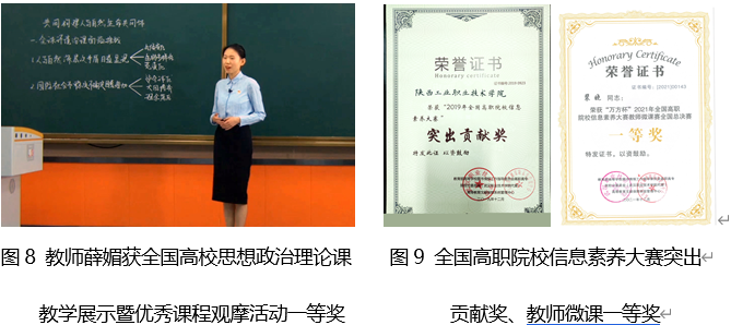 实施教师信息化素养提升计划,使教学智慧起来。2014年学校设立教师发展中心,制定《教师信息技术能力标准》《学生信息化素养评价指标体系》,创新“线上线下一体化”培训体系,近三年培训3.6万学时,获全国高校教师课程思政教学能力培训证书501份;承办由教育部主办的“全国职业院校装备制造大类课程思政集体备课会”,持续开展“教坛新秀”“教学能手”“教师教学能力大赛”等多层次教师信息化教学大赛;2021年开展“课程思政建设”主题活动,举行课程思政全员大练兵、课程思政现场教学展示等系列活动,评选“课程思政标兵”“课程思政骨干”教师6名;举办辅导员班会微课、微团课大赛,成立网络爱好者协会、传媒协会、新媒体协会等学生社团,创建个性化网站,开展线上主题活动,建设一支专业化网络思政队伍。