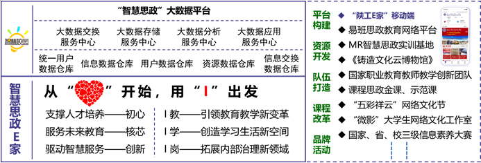 以“云大物移智”为代表的新一代网络信息技术正在重塑校园生活,互联网已经成为意识形态斗争的“主战场”,网络思政是高校立德树人的全天候阵地。学校作为“全国‘双高计划’A档建设单位”,依托“全国教育信息化试点单位”“职业院校数字校园建设实验校”“陕西省高等学校智慧校园示范校”等建设成果,聚焦思想政治教育缺乏针对性、实效性的痛点,打造“智慧思政E家”网络教育平台,不断推动新时代网络思政工作创新发展。先后取得“全国高校思想政治工作创新发展中心”“教育部课程思政教学研究示范中心”“全国党建工作示范高校”等荣誉。