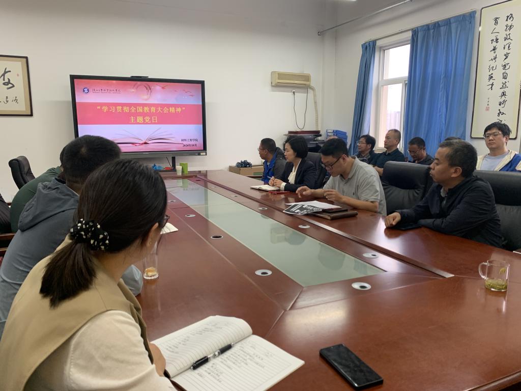 为了深入学习贯彻习近平总书记重要讲话和全国教育大会精神,提升党员的思想政治觉悟。2024年10月9日,材料工程学院党总支在行知E楼511会议室,开展了“以教育之强夯实国家富强之基——学习贯彻习近平总书记在全国教育大会重要讲话”为主题的党日活动,本次活动由材料工程学院党总支书记郝平主持,全体教师党员参加。