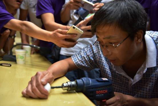 图6 山西永济公司高级技师现场演示在鸡蛋上钻孔