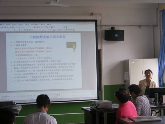 2010年7月15日上午,国资处组织相关部门对材料工程学院无损检测实验实训室进行了终验收。国资处处长鲁靖国教授、监察处处长曹瑜强教授、示范性院校建设办公室主任王兆奇教授、材料工程学院院长张普礼教授、党总支书记罗怀晓副教授、副院长韩小峰副教授、财务处王荣琦、设备科科长张全庄、项目负责人李红莉、实验员弋楠等教师参加了终验收工作。