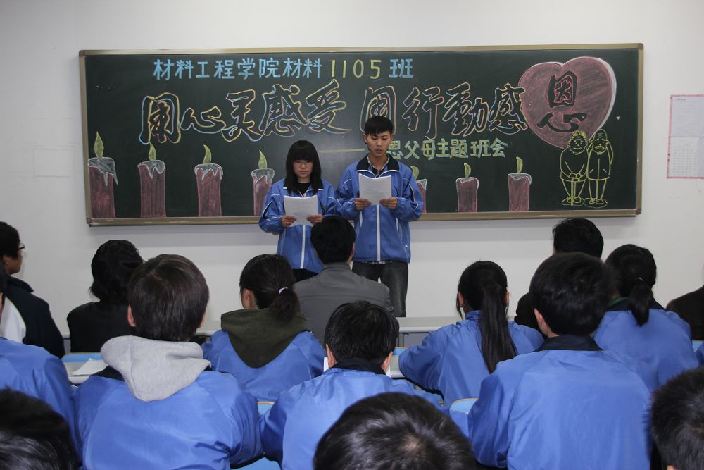 院学生工作部部长、学生处处长王超联、学生教育管理科科长王康虎、材料学院党总支书记罗怀晓、学工办主任郭旭华应邀来到材料1105班参加班会。同学们穿戴着整齐的校服,严格遵守会场秩序,该班此次班会形式多样,内容精彩纷呈,不落窠臼,李元兆同学的父母以现场录音的方式说出了对孩子的一片真情和希望;李凯瑞同学写给父亲的一封信同样感人肺腑,同学们都侧耳聆听,听着听着,感动的泪水不由的沾满了衣衫,擦湿了纸巾,老师和同学们被这感人演讲所征服,所震撼!同学们在这次活动中说出了对父母、老师、同学、朋友的感恩之情,场面温馨无比,也让全体同学在泪水中接受了心灵的洗礼。